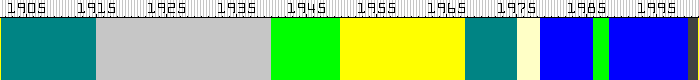 | Das sieht man: | Ein Raster des letzten Jahrhunderts. Ich habe jeder Zeitregion eine Farbe gegeben und versuche damit darzustellen, wie sich das 20. Jahrhundert in meinen Kopf bildlich darstellt. Soweit ich beurteilen kann, hat sich das Farbraster schon seit meinem Bewußtsein für das 20. Jahrhundert manifestiert, also seit der Kindheit und hat sich seither kaum verändert. Es ist weitgehend unbeeinflußt durch geschichtlische und politische Aspekte. |