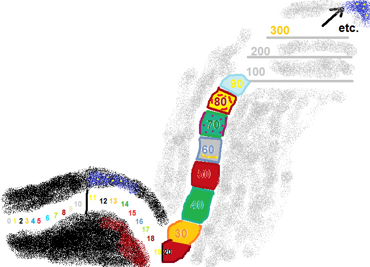 Es sieht nicht genau so aus, die Beschaffenheit der "Tunnels", in denen sich die höheren Zahlen wie "60" befinden, ähnelt der von Glas und ist transparenter, außerdem gibt es mehr Farben. Ich sehe fast jede Zahl als Individuum, aber es wäre zu viel Arbeit, das zu zeichnen. Ich mag die negativen Zahlen nicht, weil ich sie nicht kenne. Außerdem habe ich aus dem gleichen Grund auch Angst vor den sehr großen Zahlen, etwa einer Milliarde. Die Zahlen, die ich kenne, sind normalerweise freundlich :) |