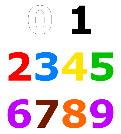 Ziffern harmonisieren mit einer Farbe und sind von ihr unzertrennlich. Kombinierte Zahlen vermischen sich farblich nicht miteinander. Jede einzelne Ziffer behält ihre zugeordnete Farbe. Ich unterscheide die Ziffern in drei Gruppen. Die Ziffern 0 und 1 haben unbunte Farben. Die Ziffern 2 bis 5 haben Farben, die im Alltagsleben sehr häufig sind. Die Ziffern 6 bis 9 haben Farben, die Abwandlungen von rötlichen Farbtönen sind. Die 6 und die 9 haben die gleiche Farbe, da sie die gleiche Form besitzen. Daraus ergeben sich folgende Farben: 0 Weiß 1 Schwarz 2 Rot 3 Himmelblau 4 Gelb 5 Hellgrün 6 Rötlich-Violett 7 Dunkelbraun 8 Orange 9 Rötlich-Violett |