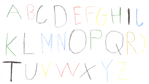 Die Farben der Buchstaben. Jannik zeichnete dies, als er gerade 8 Jahre alt wurde und die 2. Klasse besuchte.