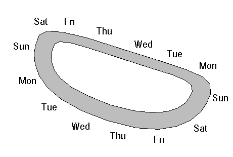 Was überhaupt nicht klappt, ist die Integration der Wochenvorstellung in die von Monaten, vielleicht weiß ich gar nicht, wie ich das sehe. Die Wochen sind auch nicht wirklich eine Wurst, sondern eher flach, das ist aber nicht so wichtig. |