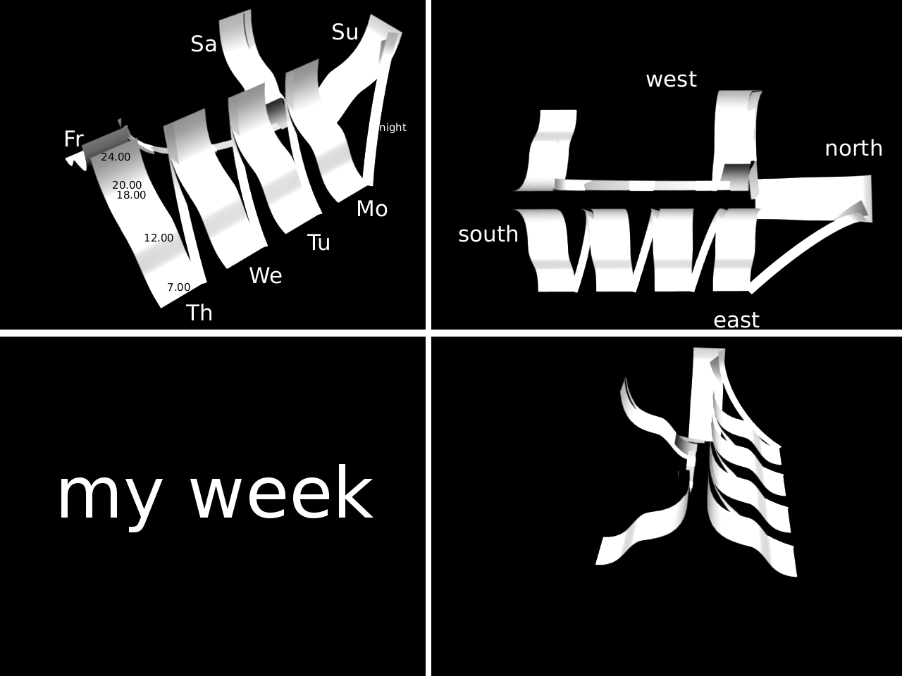 Meine Woche, angeordnet im Raum, wie ich sie jedesmal sehe, wenn ich mit einer Zeitangabe konfrontiert werde. Die Tage sind alle gleich hoch (bzw. lang) und gleich breit, haben alle die gleiche Form. Der Tagesablauf ist s-förmig: Am Morgen steil, am Mittag flacher und am Abend wieder steil. Die Nächte sind viel dünner als die Tage und nicht s-förmig. Der Tag beginnt so um die 7.00 und geht bis um 24.00. Der Morgen und der Nachmittag nehmen am meisten Platz in Anspruch. Während dem Fortschreiten des Tages oder der Tageszeit komme ich in dieser Raumwoche wie eine Spielfigur auf einem Spielbrett voran. Die Blickrichtung ist jeweils Richtung Zukunft. Ich befinde mich aber nicht auf der Fläche der Ebenen, sondern schwebe in einiger Entferrnung darüber, dass ich dennoch die ganze Woche sehe. Die Raumwoche ist für mich wie jeder andere vertraute Raum, den man sich in Gedanken vorstellen kann. Das Erfahren des Raumes tritt immer auf bei einer Zeitangabe, ich kann das nicht unterdrücken. Ich sehe die Woche schon, seit ich denken kann auf diese Weise. Montag bis Donnerstag sind nebeneinander liegend. Freitag ist gegenüber Donnerstag und diesem zugewandt. Samstag ist gegenüber Montag und diesem abgewandt. Sonntag ist gen Norden zugewandt. Die Tage haben keine Farben oder Schattierungen, ich sehe praktisch nur die Umrisse und Flächen. |