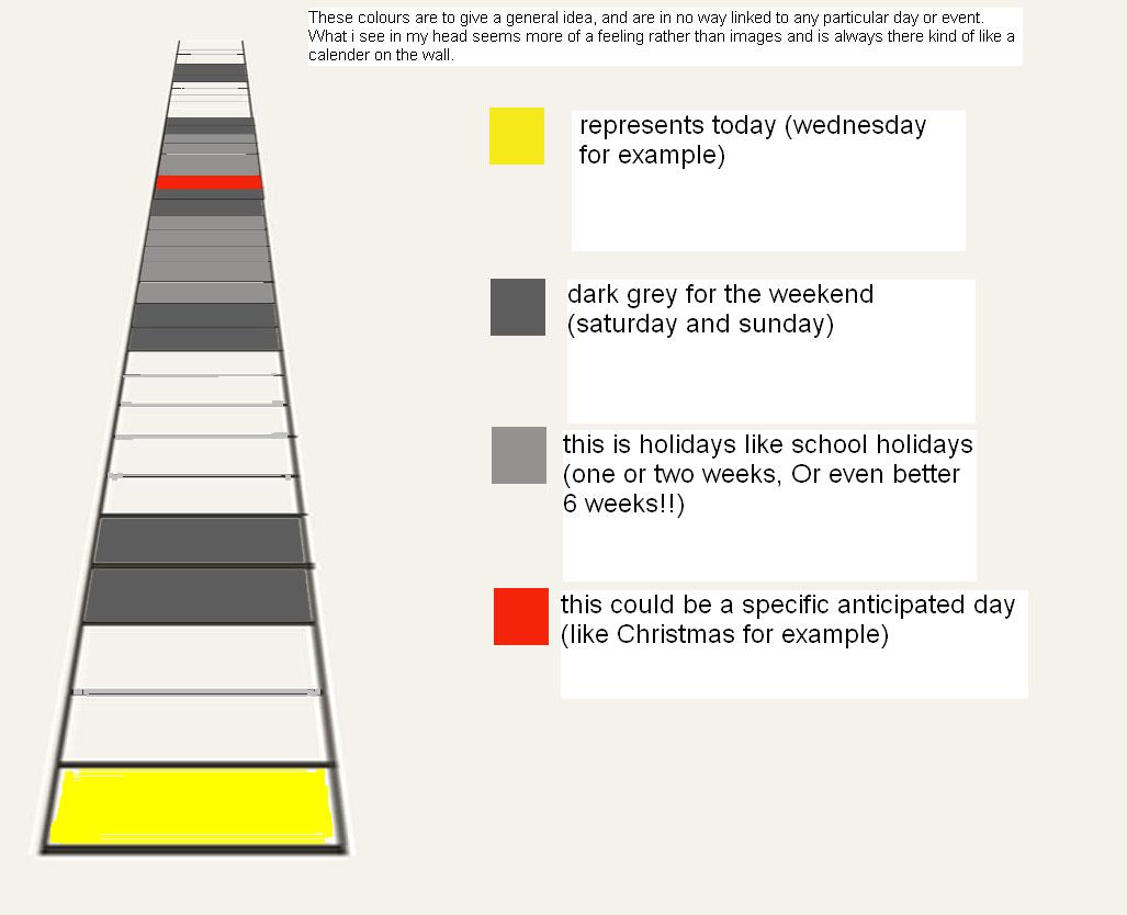 Diese Farben sollen eine ungefähre Ahnung geben und sind in keiner Weise fest mit einem bestimmten Tag oder Ereignis verbunden. Was ich in meinem Kopf sehe, wirkt mehr wie ein Gefühl als Bilder und ist wie eine Art Kalender an der Wand.