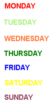 Für mich hat schon immer jeder Tag eine bestimmte Farbe gehabt (meine Schwester hat die gleiche Vorstellung, aber bei ihr sind es andere Farben!). Dass der Montag rot ist, hängt mit dem Buchstaben M zusammen - allerdings sehe ich keine Verbindung zwischen Buchstaben und den anderen Tagen. Es gibt zwar eine schwache Beziehung, diese hat jedoch damit zu tun, dass Konsonanten "deutliche" Farben wie rot und blau haben, "weiche" Konsonanten wie J and Y grün sind und Vokale (oder zumindest Monate, die mit Vokalen beginnen, sich gelblich-orange anfühlen. |